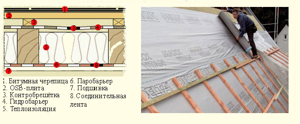 Пленка крепится непосредственно к стропилам или другой несущей конструкции крыши скобами механического сшивателя или оцинкованными гвоздями с плоскими шляпками. Расстояние между стропилами при креплении пленки не должно превышать 1,2 м. Высота провиса пленки должна быть не более 2 см. После крепления пленки к несущим конструкциям крыши к ним необходимо прибить контррейки сечением 3х5 см с последующей нашивкой обрешетки. В противном случае не будет обеспечен отвод водяного пара.